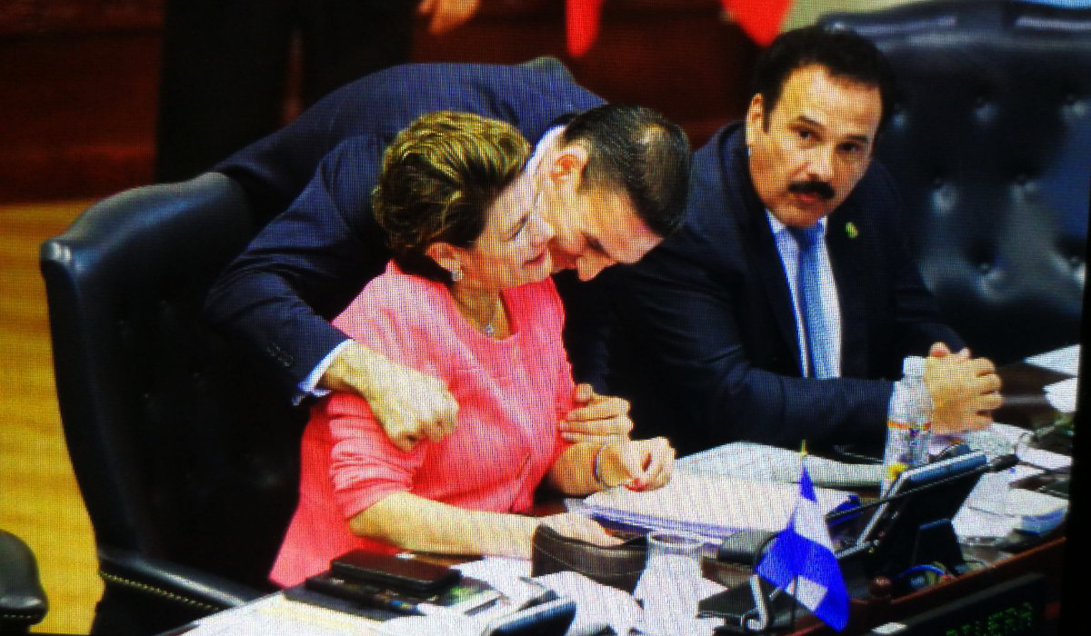 Los candidatos a la alcaldía de San Salvador Jackeline Rivera y Ernesto Muyshondt del FMLN y de ARENA respectivamente se saludaron efusivamente hoy durante la primera sesión plenaria luego que se conociera la candidatura de Jackeline Rivera por parte del FMLN luego de la expulsión de Nayib Bukele de las filas del partido de izquierda.